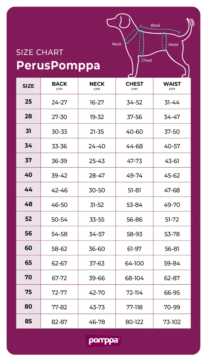 Pomppa-maten zijn gebaseerd op de ruglengte van de hond in centimeters. Kies de juiste maat voornamelijk op basis van de ruglengte van je hond. De pasvorm van de PerusPomppa is vergelijkbaar met die van de Kuori-, Sade- en KevytPomppa.
