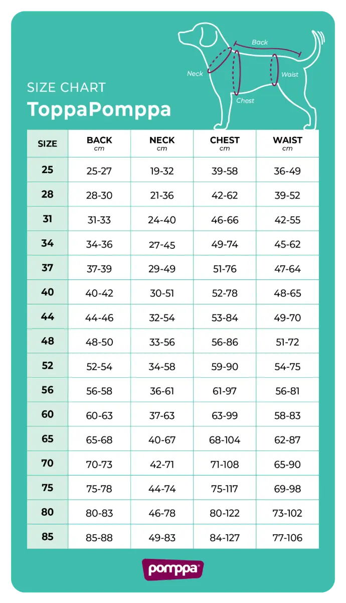 Pomppa-maten zijn gebaseerd op de ruglengte van de hond in centimeters. Kies de juiste maat voornamelijk op basis van de ruglengte van je hond. Let op, ToppaPomppa heeft een lossere pasvorm in vergelijking met andere Pomppa-jassen. Als de afmetingen van je hond tussen twee maten vallen, raden we aan de kleinere maat te kiezen.